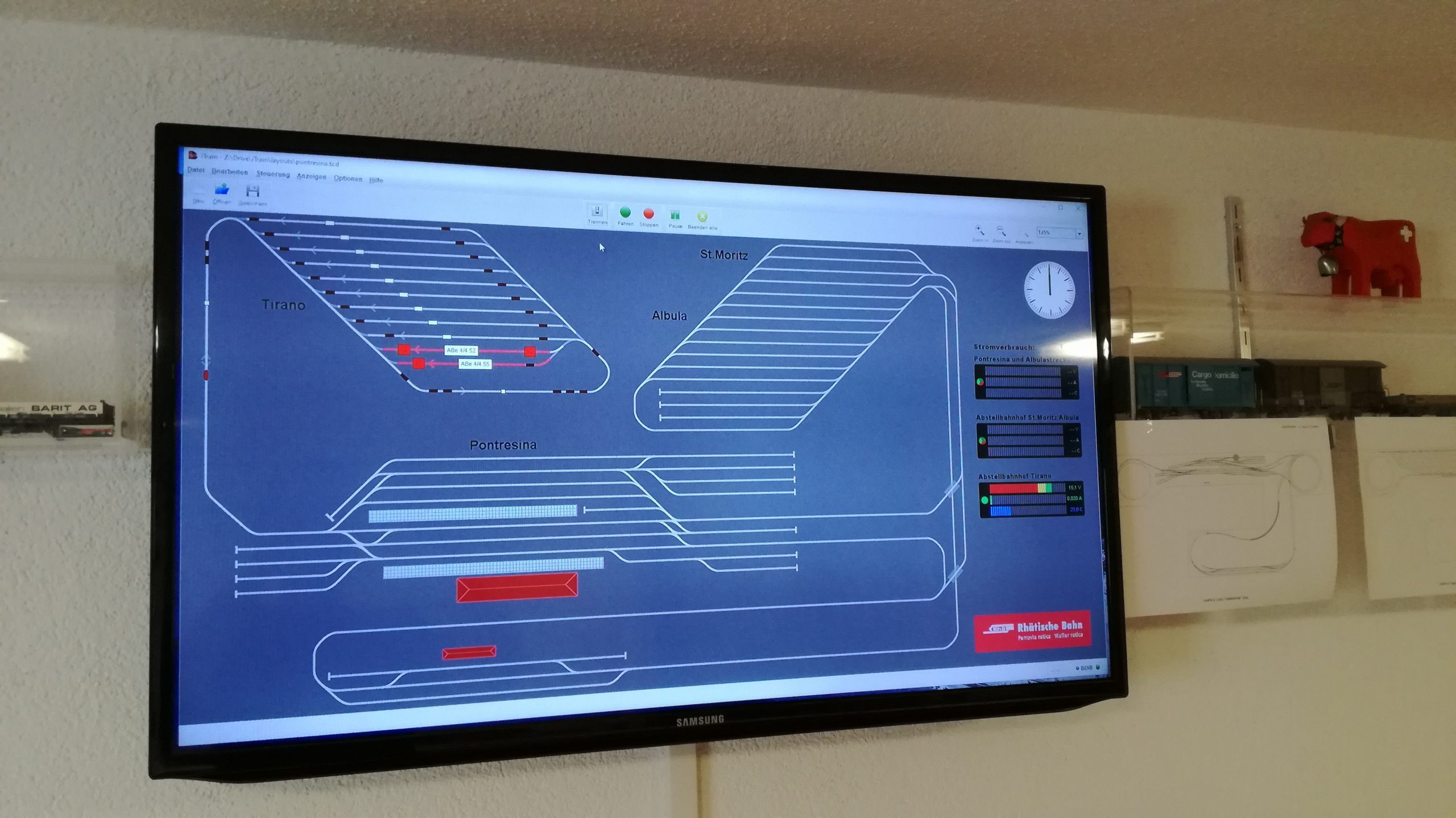 An der Wand wurde bereits ein 40″ Bildschirm montiert. Auf diesem ist der komplette Gleisplan der Anlage und sämtliche Zugbewegungen zu sehen.
